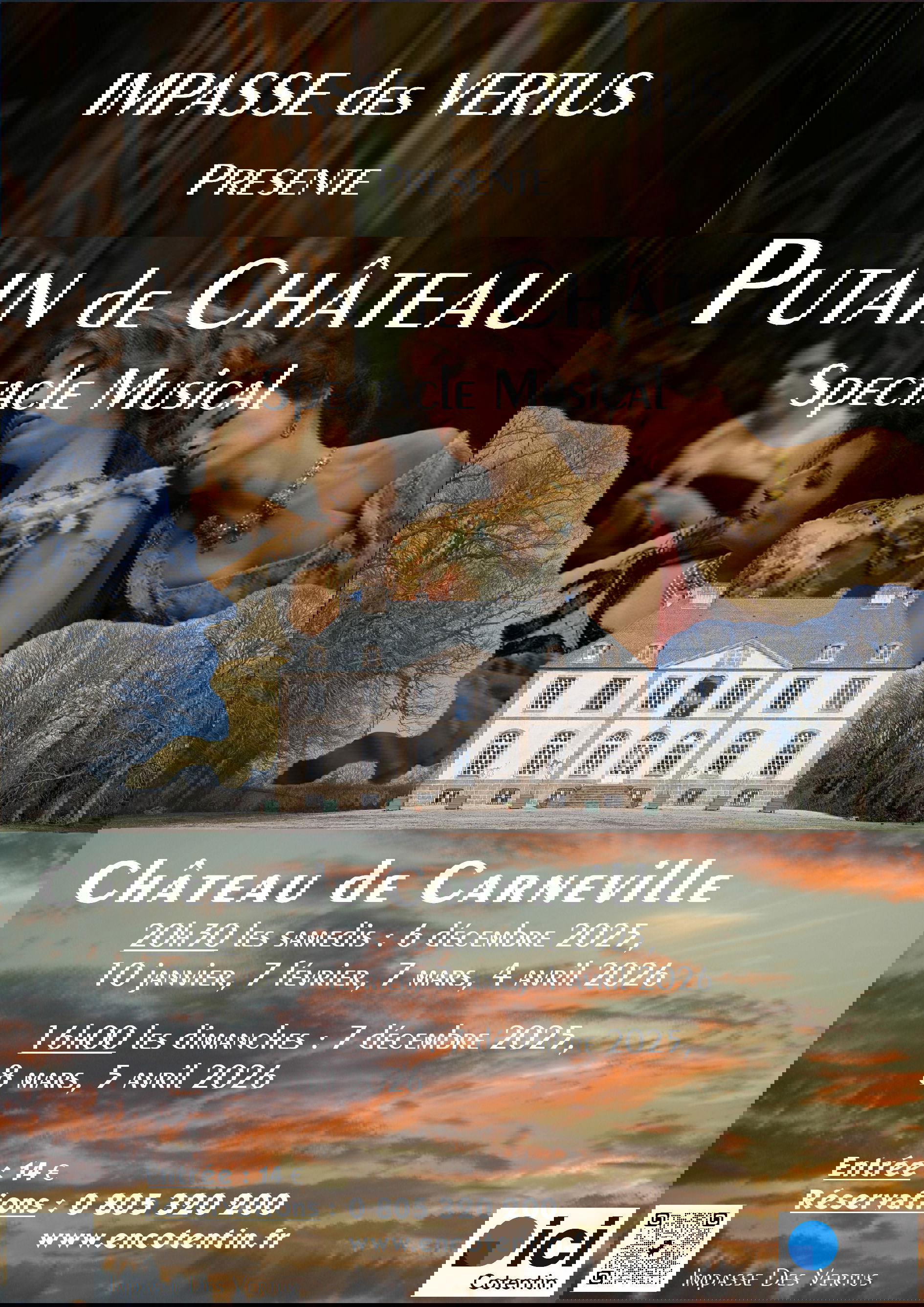 Après le spectacle musical "Fréhel, diva des abîmes", créé au théâtre de l'Arlequin à Cherbourg-en-Cotentin, en février 2025, puis le spectacle nocturne "Le Château des Sortilèges", parcours de contes en musique inspiré par et conçu pour le Château de Carneville, qui s'est joué durant tout l'été 2025, IMPASSE des VERTUS propose de décembre 2025 à avril 2026 le spectacle musical "Putain de Château", inspiré par une page occultée de l'histoire du Château de Carneville, qui abrita un bordel entre ses nobles murs durant le dernière guerre mondiale.